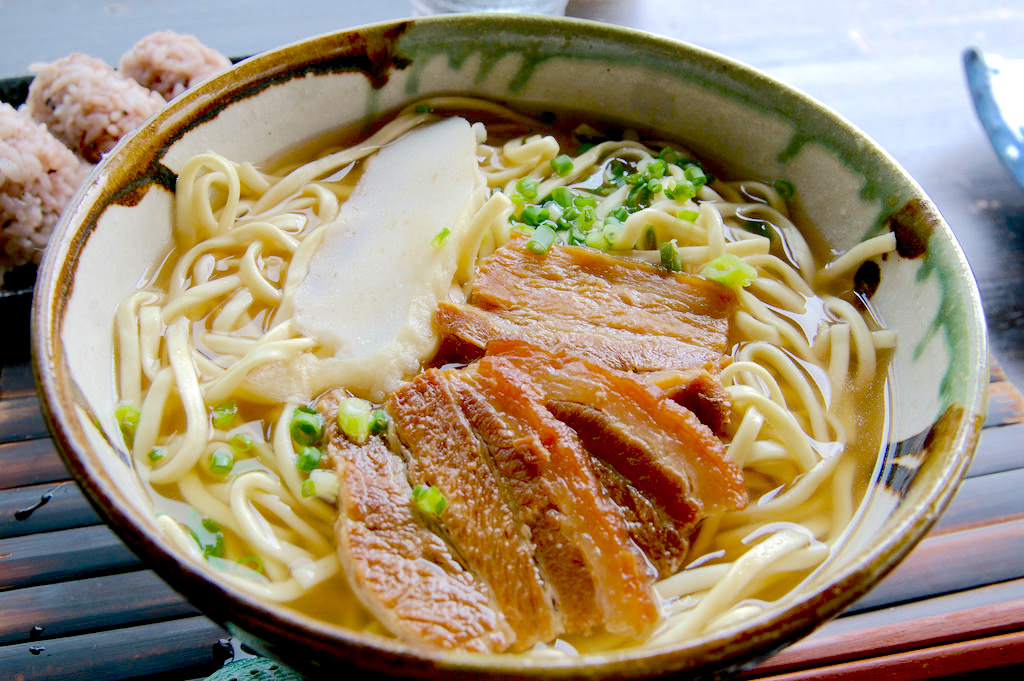 Okinawa-sobaOkinawa-soba is similar to ramen noodles, A common topping is soft boiled pork, in which case the dish is called Soki-soba, but there are other varieties. The dish generally also includes green onions, kamaboko (fish cake) and red pickled ginger. |
