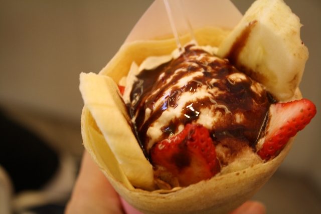 Crępe in HarajukuCrępes are the speciality of Takeshita-dori in Harajuku, There 9 different crępe shops that have various creamy and decorative confectionery. |