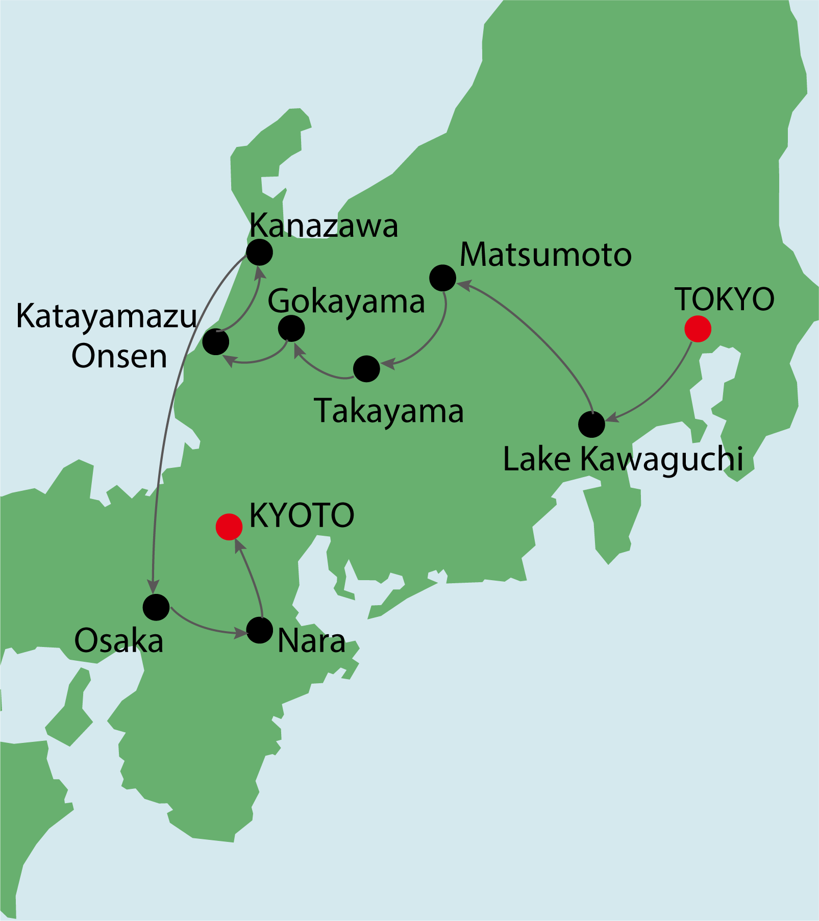 - Hotel: Tokyo (3 nights), Matsumoto (1 night), Takayama (2 nights), Katayamazu Onsen (1 night), Kanazawa (1 night), Osaka (2 nights), Kyoto (3 nights)