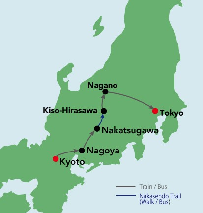 - Hotels: Kyoto (3 nights), Tsumago (1 night), Kiso-Fukushima (1 night), Narai (1 night), Tokyo (2 nights)