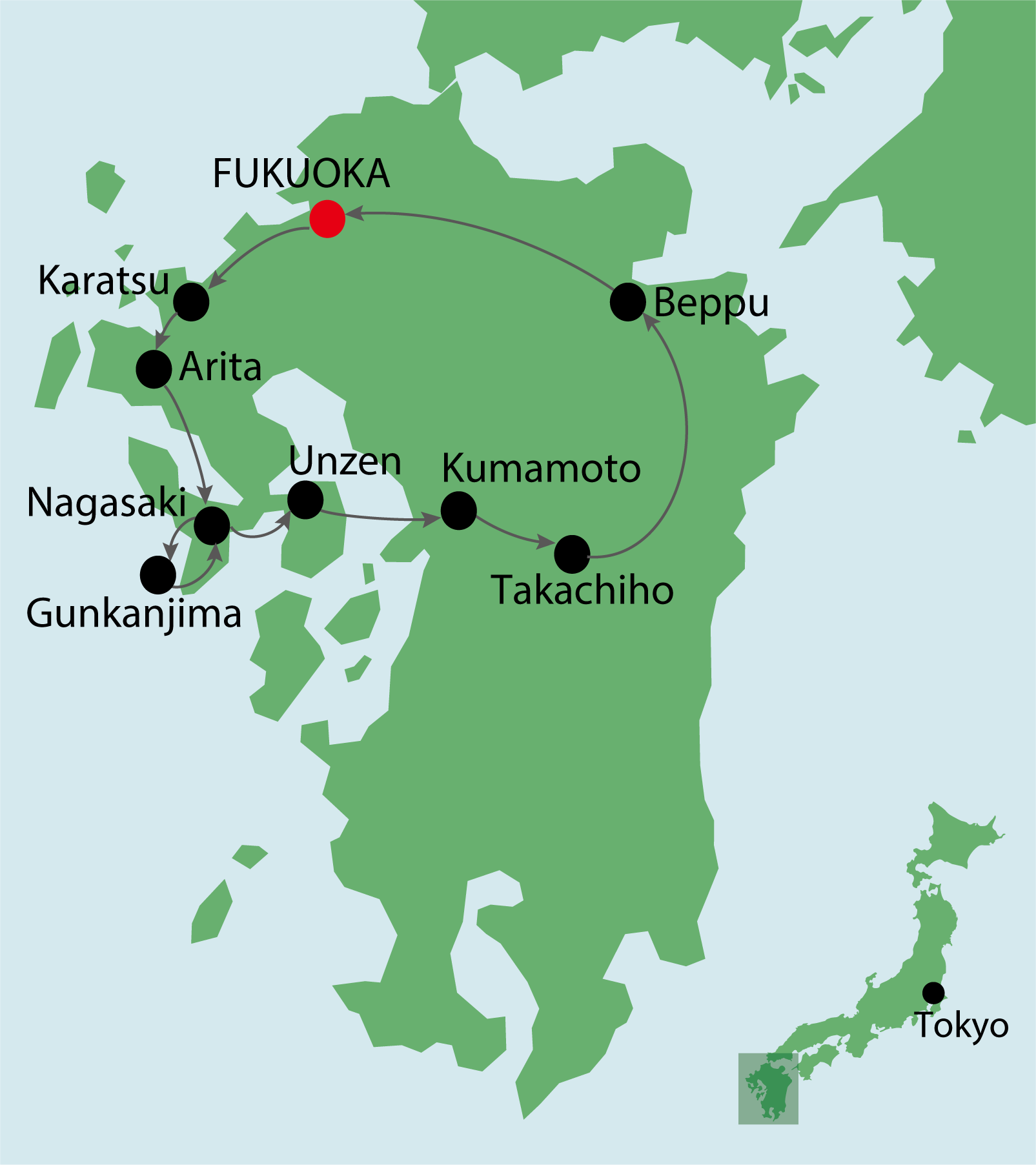- Hotel: Karatsu (1 night), Nagasaki (1 night), Unzen (1 night), Kumamoto (1 night), Takachiho (1 night), Beppu (2 nights), Fukuoka (1 night)